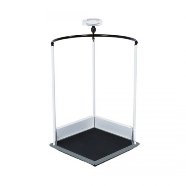 El pasamanos integrado en la báscula permite que el paciente se sujete mientras se realiza el pesaje.
